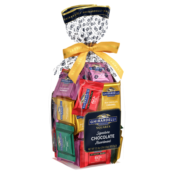- Contains a 2lb assortment of individually wrapped SQUARES in 4 flavors: Milk Chocolate Caramel, Dark Chocolate 60% Cacao, Dark Chocolate Mint & Dark Chocolate Raspberry