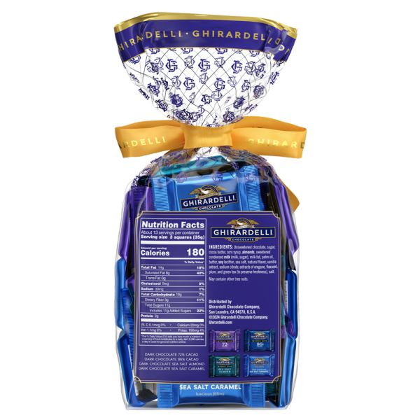 - Contains a 1lb assortment of individually wrapped SQUARES in 4 flavors: Intense Dark 72% Cacao Dark Chocolate, Intense Dark 86% Cacao Dark Chocolate, Intense Dark Sea Salt Almond Dark Chocolate & Dark Chocolate Sea Salt Caramel