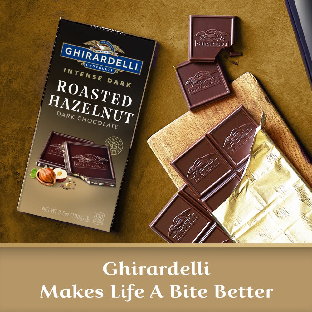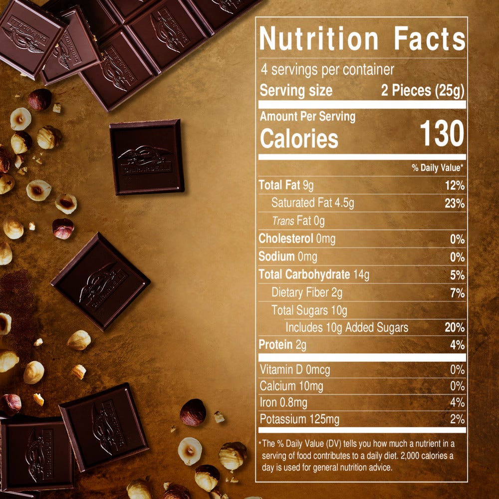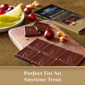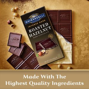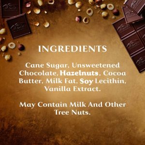 - Intensely delicious dark chocolate squares with subtle flavors of roasted hazelnut pieces