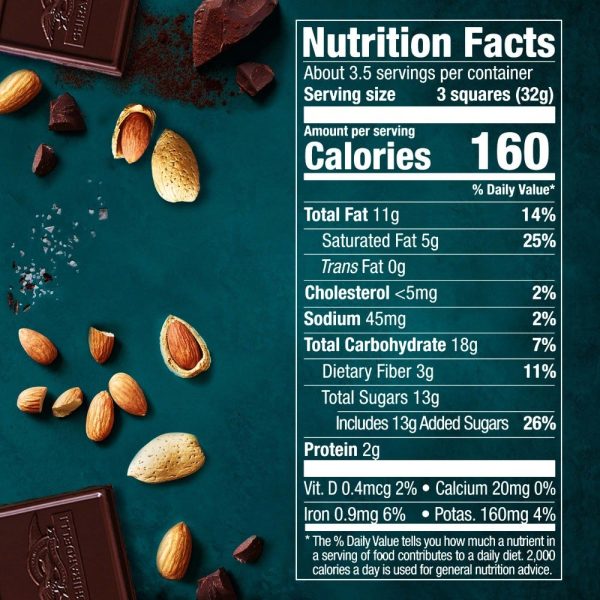 - Slow-melting dark chocolate is perfectly complemented by roasted almonds and sprinkled with a hint of sea salt